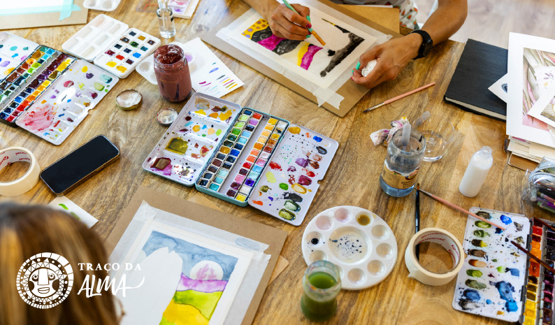 A IMERSÃO CRIATIVA TRAÇO DA ALMA é um programa de arteterapia desenvolvido pela ilustradora Anna Anjos especialmente para o contexto corporativo, que une expressão criativa, cuidado psíquico e desenvolvimento funcional, com impacto real na saúde mental, na presença e na precisão do fazer manual.